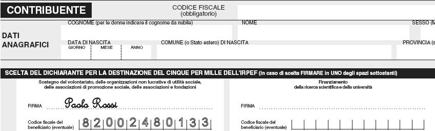 Anche quest’anno c’è la possibilità di destinare il 5 x mille alle organizzazioni non lucrative di utilità sociale (ONLUS) e quindi anche per il nostro istituto basterà indicare, come nell’esempio, il codice fiscale dell’Ente.